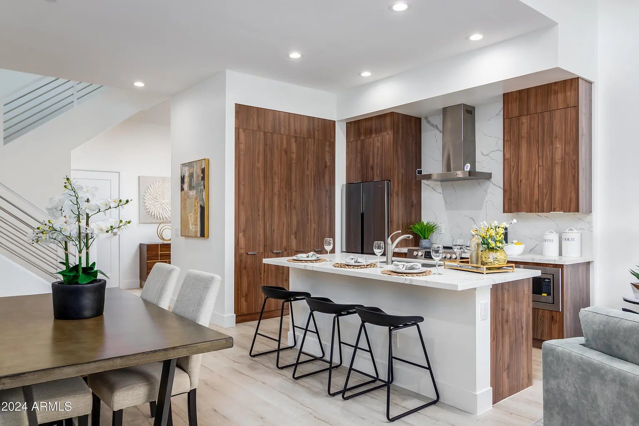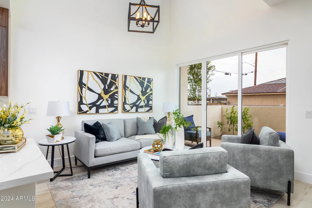 Centered in midtown Phoenix at the Northeast corner of Encanto Village sits these newer ultra-modern townhomes. Minutes to Uptown, Downtown, the 101, 10 and 51. So close to all that central Phoenix has to offer; hiking, sporting venues, music venues, food scene and nightlife. Near many of the major area hospitals such as Phoenix Children's Hospital, Banner University Medical Center and VA Medical Center. Walking distance to the light-rail that runs on Central connecting Uptown to Downtown Phoenix, and extending as far as Mesa. The townhomes boast modern finishes that can also be upgraded prior to moving in, if you choose to make your home a real showpiece. First level offers an open floor plan and kitchen with energy-efficient appliances, quartz countertops, rich wood cabinetry and a large center island. Spacious and light-filled 3 bedrooms on the second level feature 9ft+ ceilings and more than one flex space giving you extra room for family, den or office. You can see Camelback and Piestewa out of the primary bedrooms. Private courtyard in the front for outdoor dining, entertaining and relaxing. This home is an end unit. Modern technology; pre-wired for EV charging, LAN, TV, Ring door bell, garage smartphone enabled door. Also, solar ready; home was pre-wired during construction so no additional electronic work needed when installing panels.